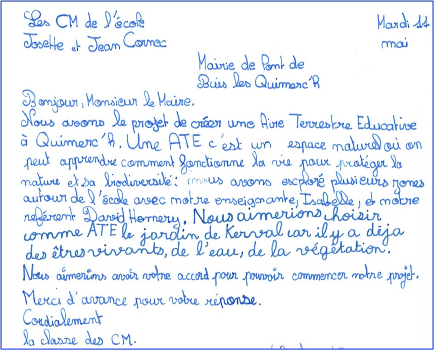 Au cours des sorties sur l’ATE, des conseils de la Terre et des interventions de spécialistes, les élèves créent leur projet et décident des futures étapes à réaliser sur leur ATE. Chaque fin d’année, lors de la fête de l’école, les élèves présentent aux parents, aux élu·es, et tous les habitant∙es qui le souhaitent, les projets et actions menées au cours de l’année. C’est une nouvelle occasion de responsabiliser les élèves.Extrait de la lettre envoyée à la mairie en 2021 © Isabelle Leroy